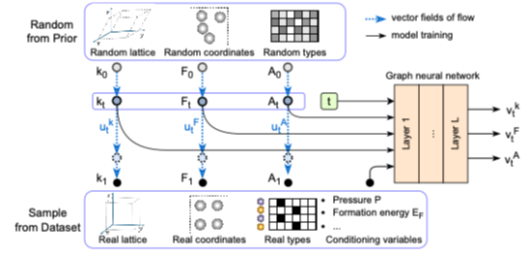 在本研究中,团队采用连续归一化流与流匹配技术,提出了基于流模型的晶体结构生成框架CrystalFlow。CrystalFlow基于晶体图表示,结合等变消息传递网络,在架构层面严格遵循晶体的周期性与E(3)不变性,实现了对晶格参数、原子坐标与元素种类的高效学习与联合生成。进一步,研究引入无分类器引导策略,使模型能够在给定外部压强、形成能等条件下实现受控生成。系统的测试结果表明,相较于前期晶体结构生成模型,CrystalFlow在结构预测准确率、结构生成速度以及高压相结构生成等方面均取得了显著提升,为复杂体系的结构预测提供了新的有力工具。