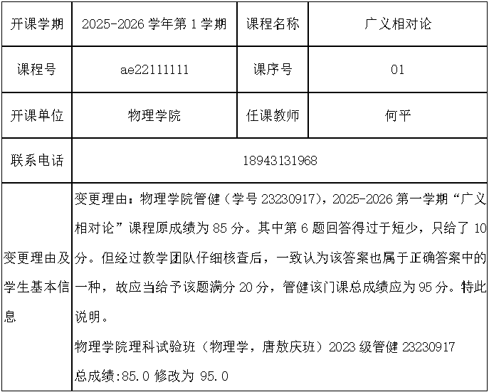 根据《关于进一步明确本科生课程考核等有关问题的通知》(校教字[2018]47号)文件有关精神,现对以下课程成绩更正进行公示: