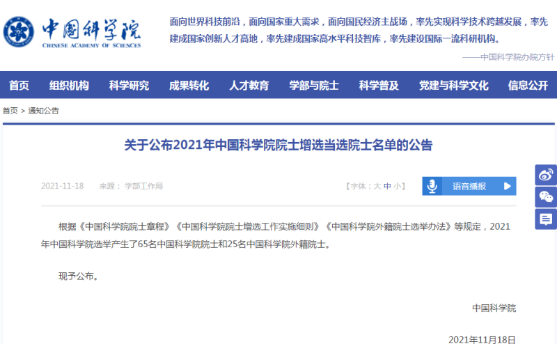 院士增选当选院士名单,此次选举共产生了65名中国科竞彩足球比分